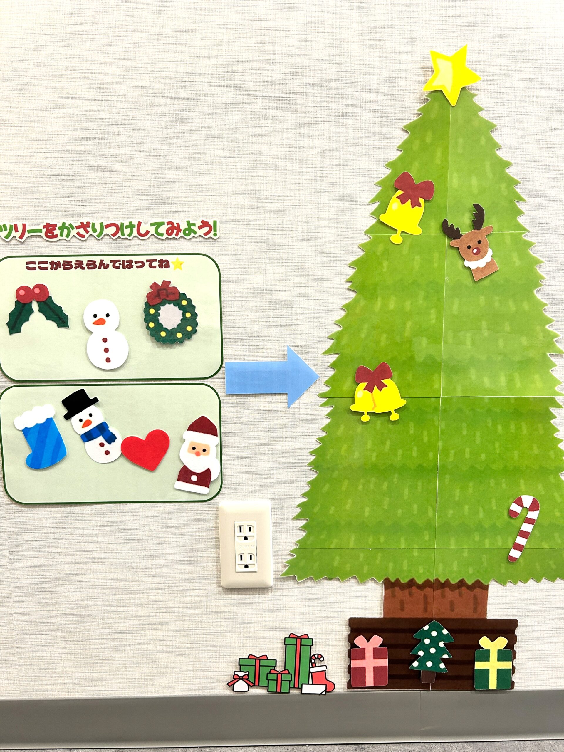 オーナメントを自由に貼って、はがして、オリジナルのクリスマスツリーを作れる掲示物です✨✨